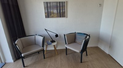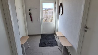 Vi er flyttet ind i huset. Der er indgang til klinikken via gavlen af huset, se forsidebilledet, det store billede. På døren står der: Tove Mathiesen speciallæge i psykiatri. Tag plads i gangen (venterummet). Du hentes her af din behandler.
