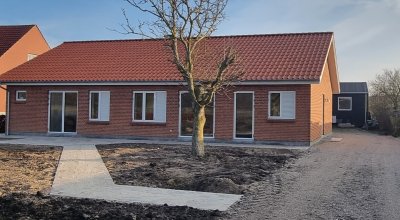 Vi er flyttet ind i huset. Der er indgang fra gavlen af huset, se forsidebilledet, det store billede.